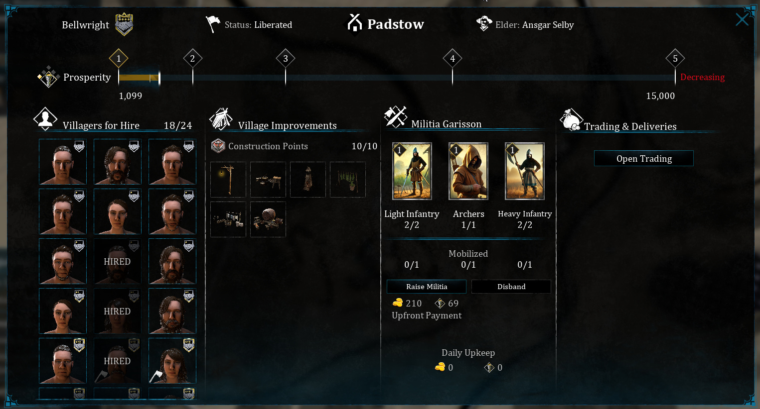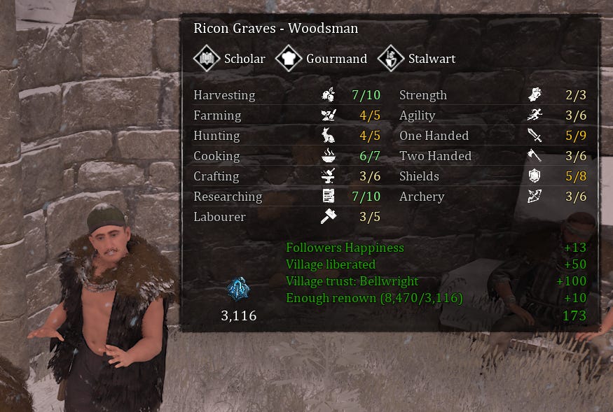 Critically, new villagers cost renown and can only be recruited (poached) from towns. To get better villagers we must reach relationship milestones.