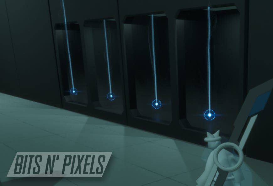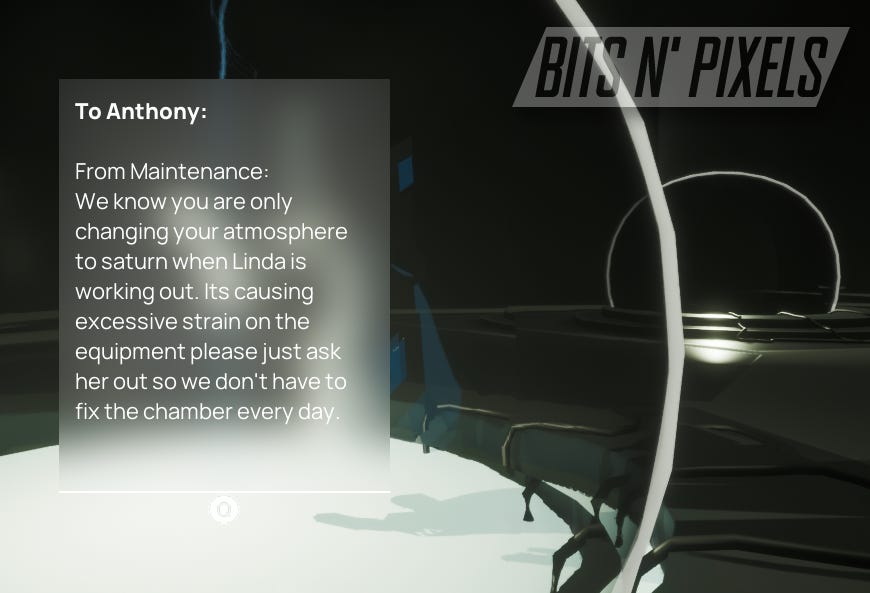 I worked from general to specific where I could. There was a room labelled “Gym” which was very futuristic looking, and came very pre-defined. The gym contained little terminals connected to futuristic looking orbs. Obviously those are atmospheric simulation chambers for exercising. Well, what state would those chambers be left in? Some people would have their chambers set to earth, sure. But wouldn’t there be some guy who would set his gravity to Saturn to show off whenever a girl comes in. Ok but how does the player find this out? What if maintenance left a secret note that the player can find telling that guy to just ask the girl out because he’s putting excessive strain on the equipment.
