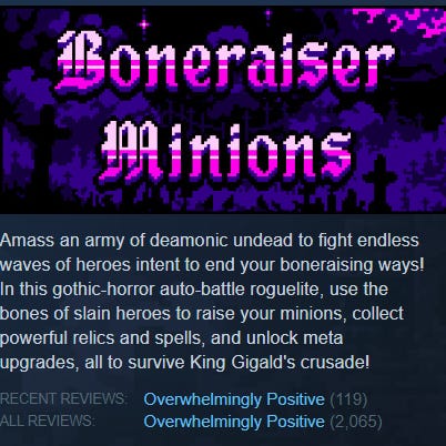 Overall, I’m happy these games are doing well. I love ‘deconstructionist’ games, and would love to see other genres deconstructed like Vampire Survivors.