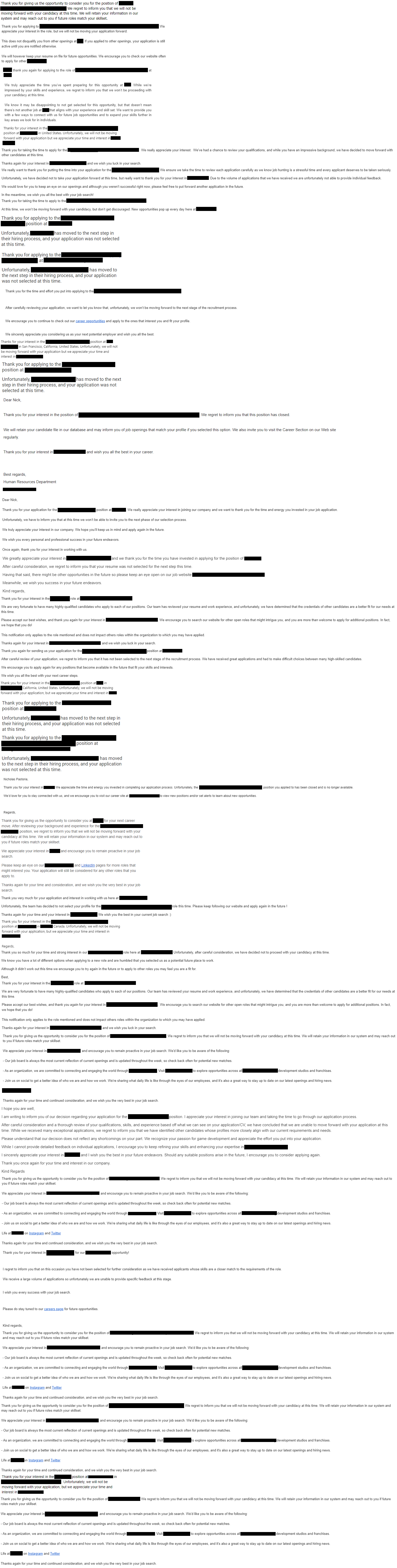I’ve put together a small art piece I call “A compilation of unfortunate regrettable messages.” It’s a compilation of all the feedback I’ve gotten since I started applying for jobs.