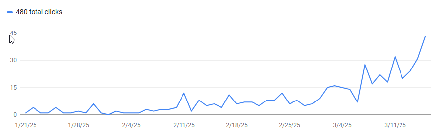 This is a graph from google analytics showing my google clicks per day. Notice this trend similarly goes up. I’d like again to state that this is not because of any single articles success, but because of the library of articles I’ve built.